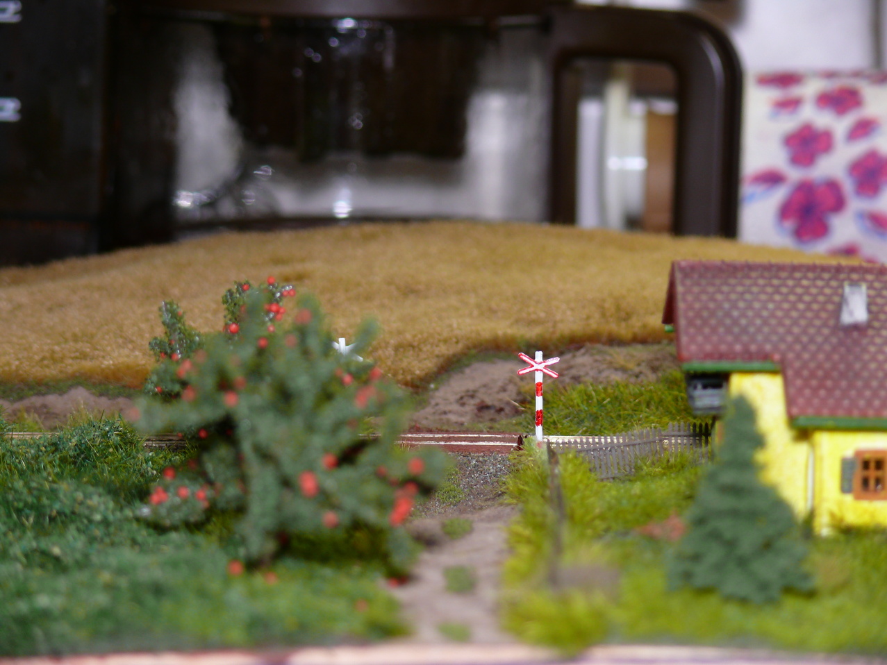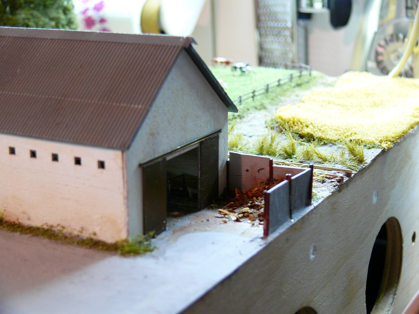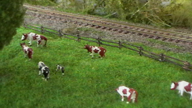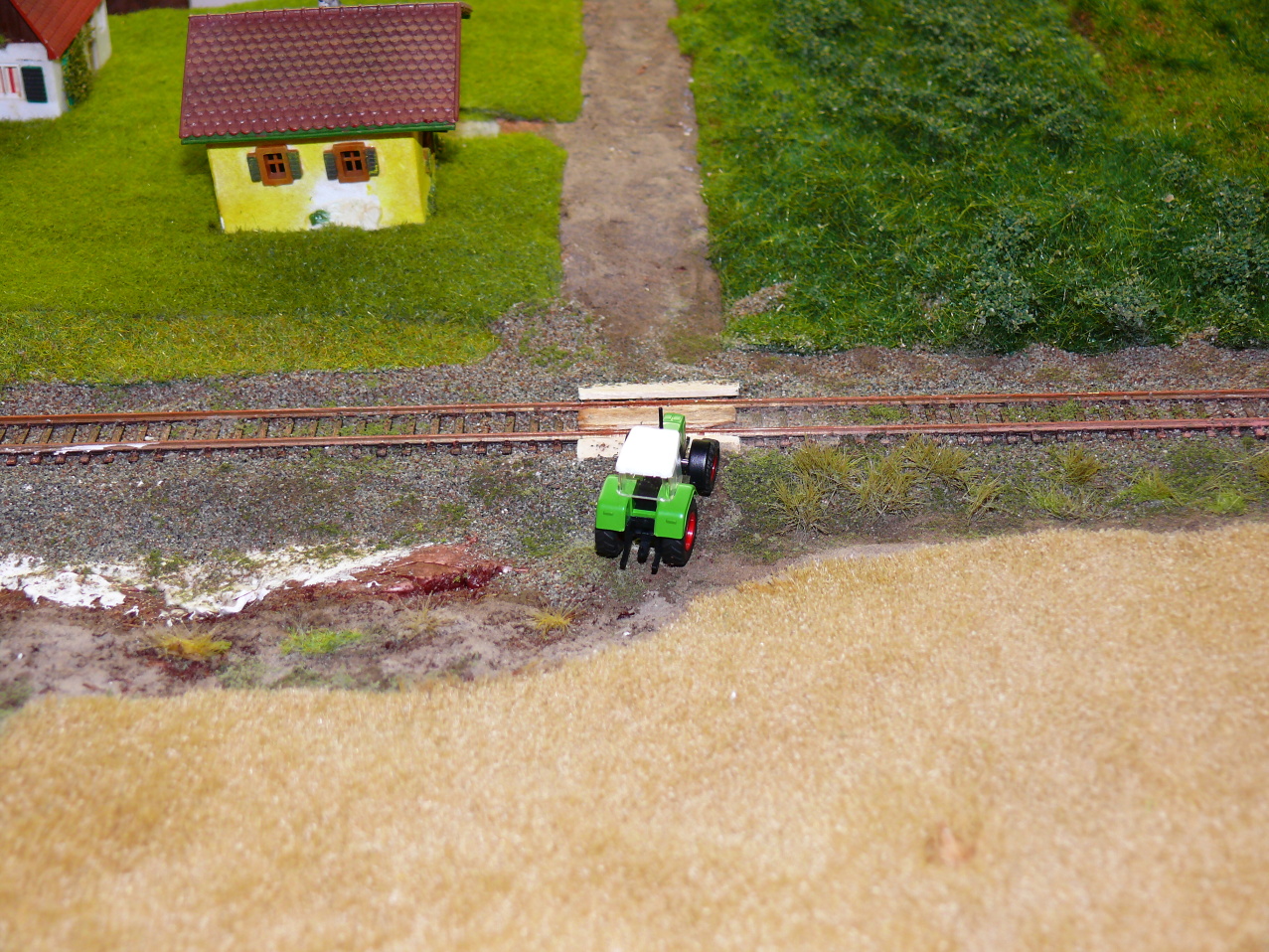 Pole s obilím a pokračovaní na druhém modulu. Vedle připravená pastva pro krávy. Na proti pastvě bude malé JZD. Bohužel ještě nedorazilo jako kravičky. Přes koleje přejíždí traktor Zetor.
