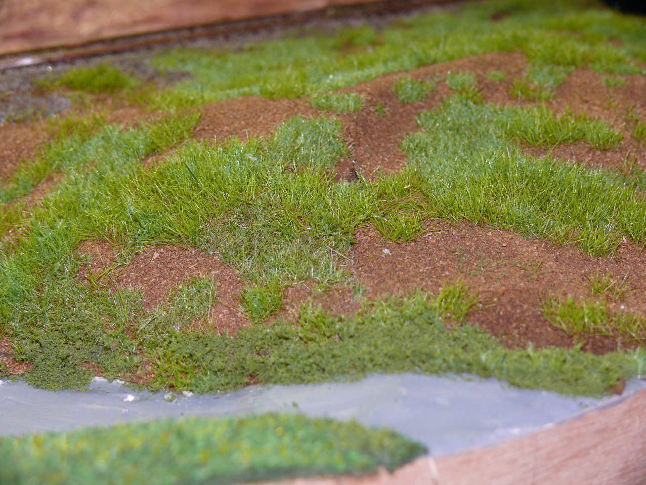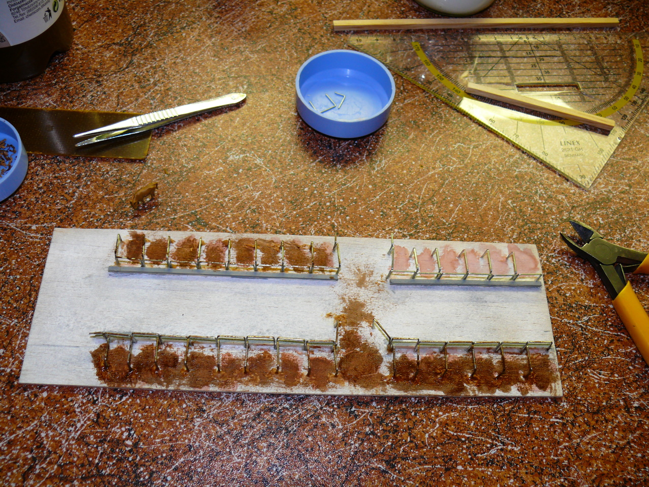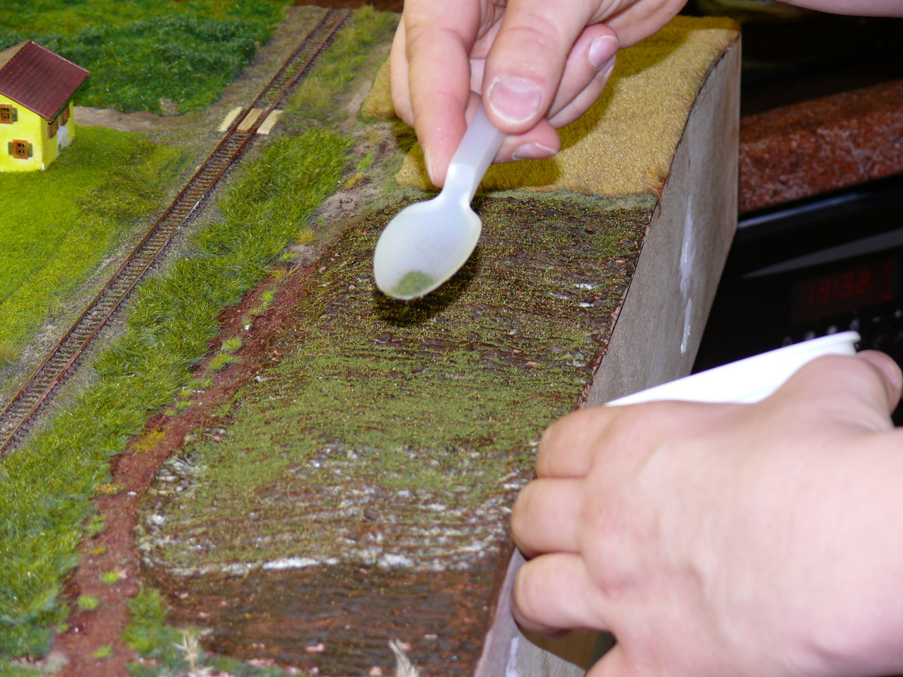 Začal jsem s foliažemi od Model scene a Poláka. Podklad pro foliáže jsem vždy natřel lepidlem s hnědou barvou. Nemusím se bát, že bude pak prosvítat polystyrén.