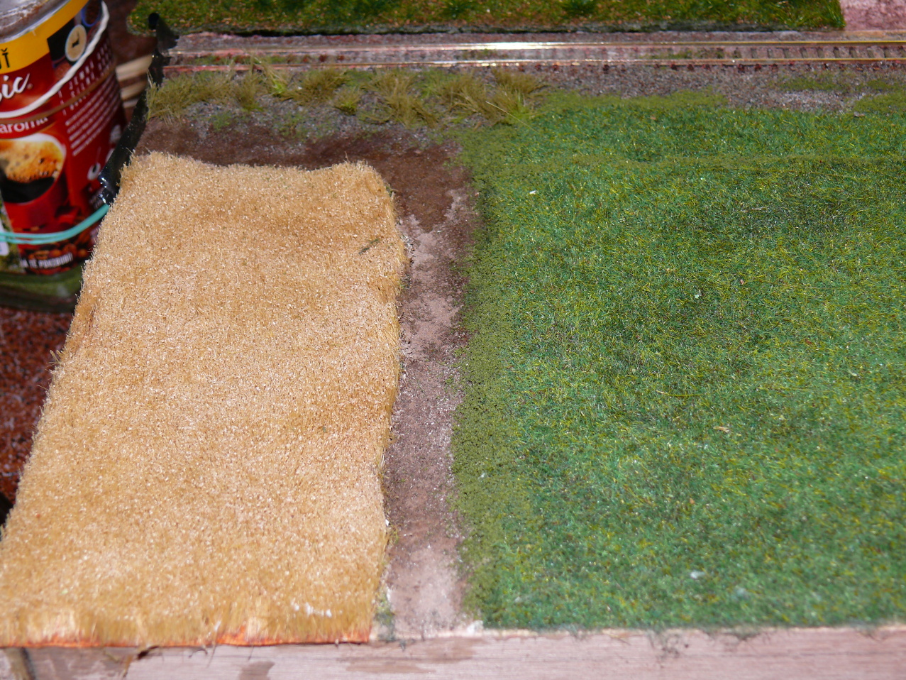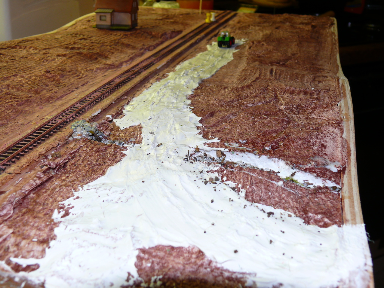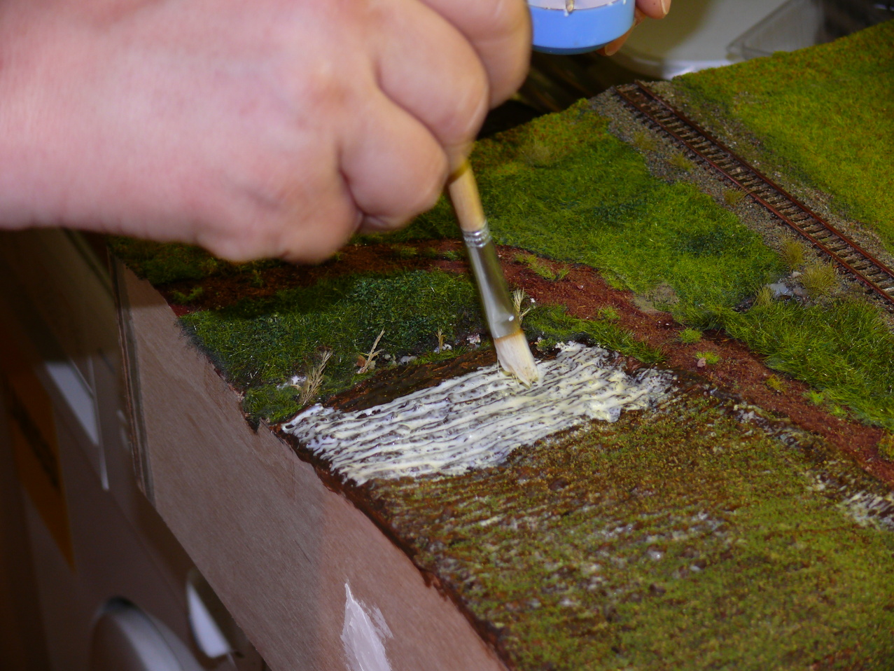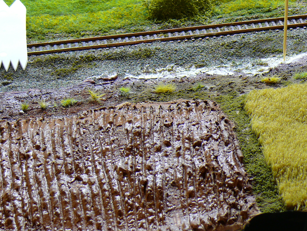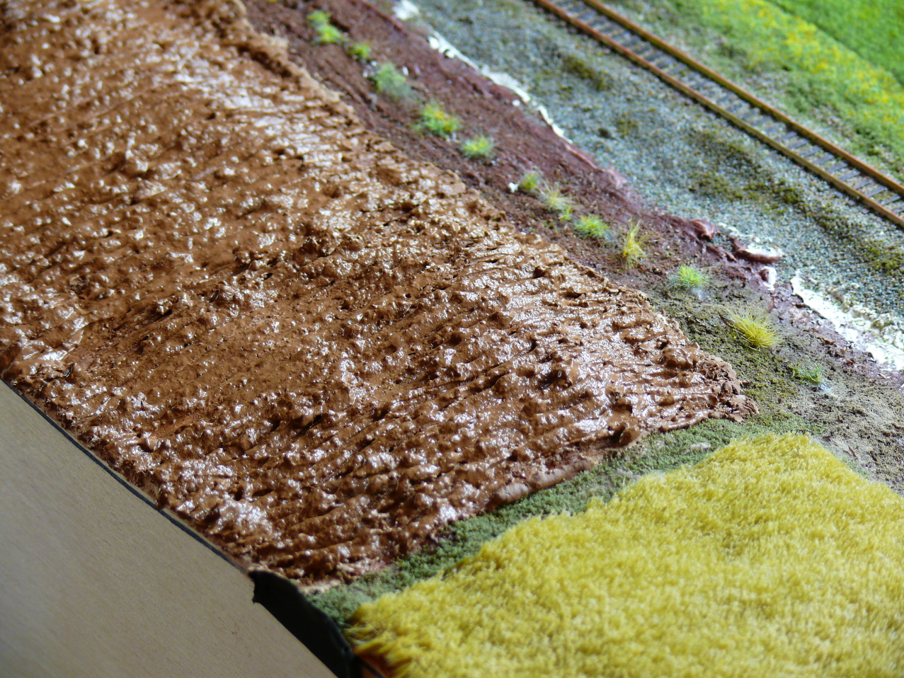 Rozhodl jsem se vedle obilného pole vytvořit pole bramborové. Na základ pole jsem použil pomalu schnoucí sádru a na místo vody jsem nalil malířskou barvu viz obrázek a tím jsem docílil barvy půdy.