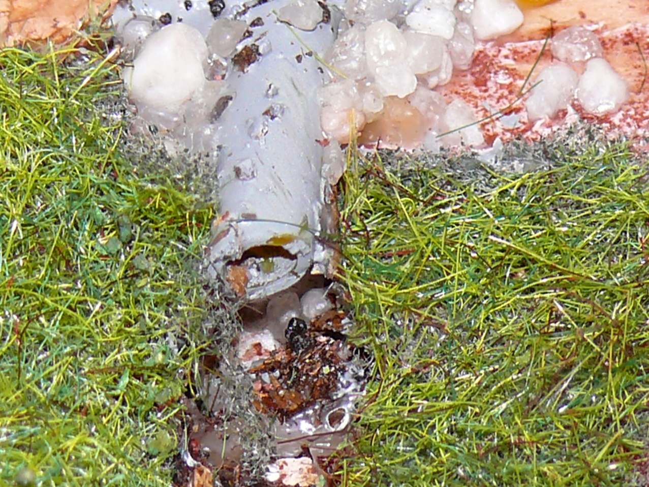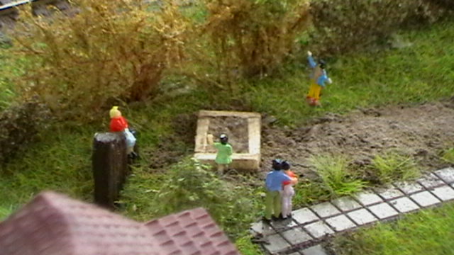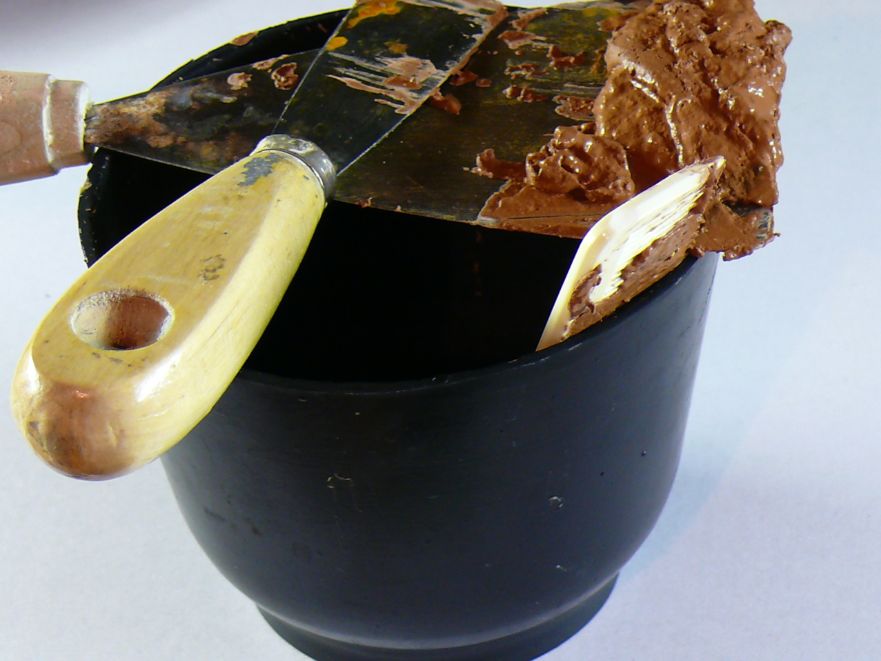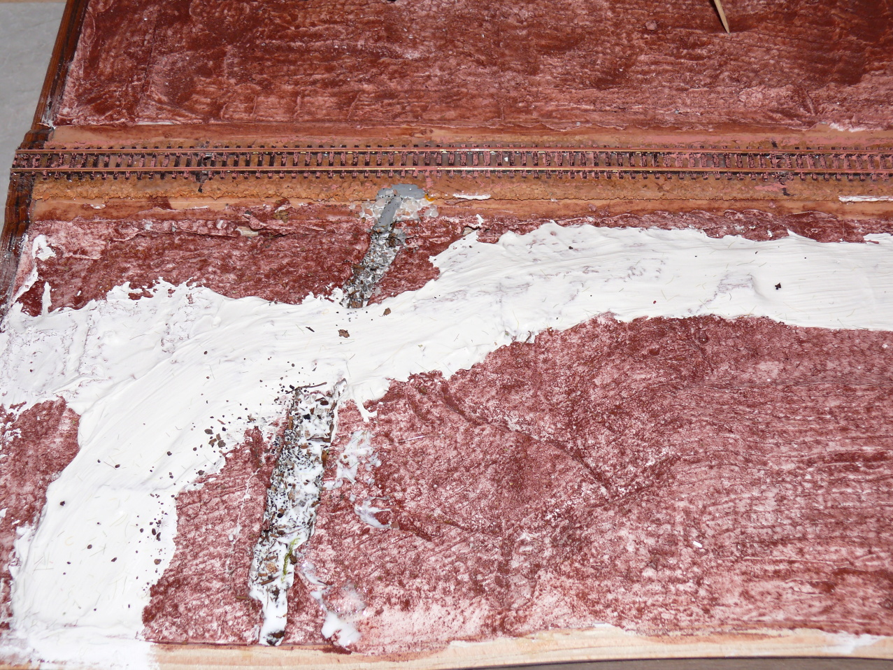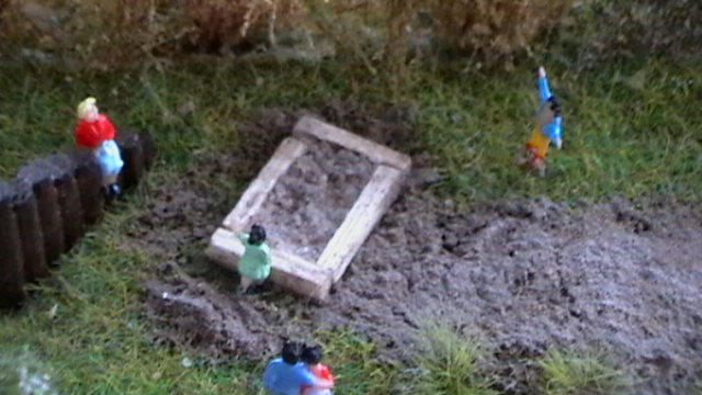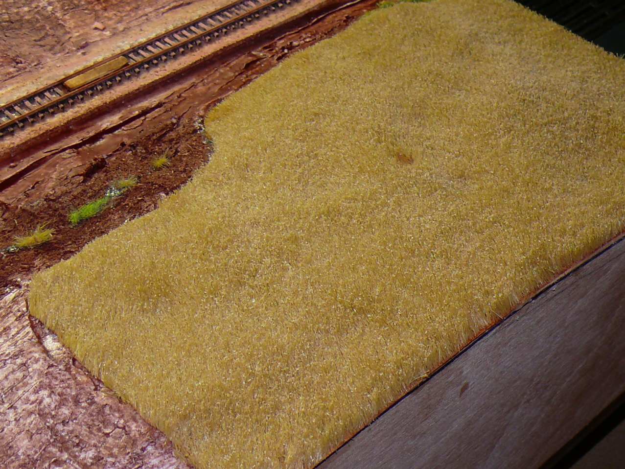 Rozhodl jsem se vedle obilného pole vytvořit pole bramborové. Na základ pole jsem použil pomalu schnoucí sádru a na místo vody jsem nalil malířskou barvu viz obrázek a tím jsem docílil barvy půdy.