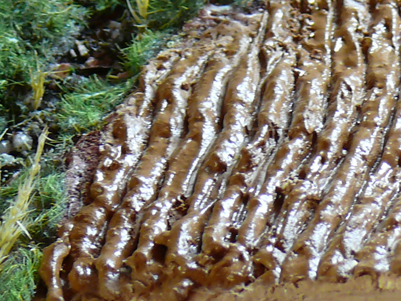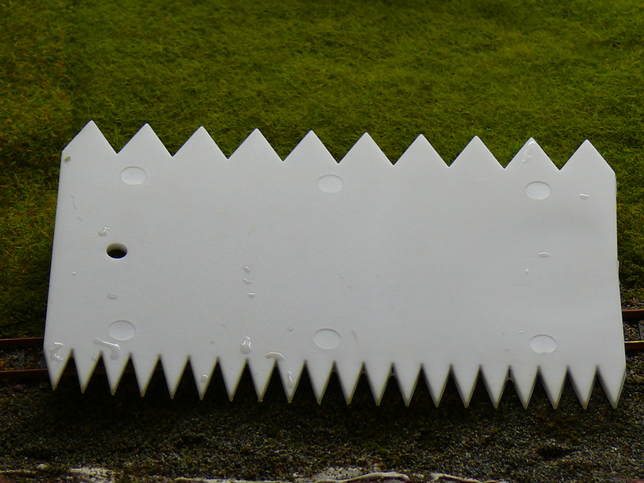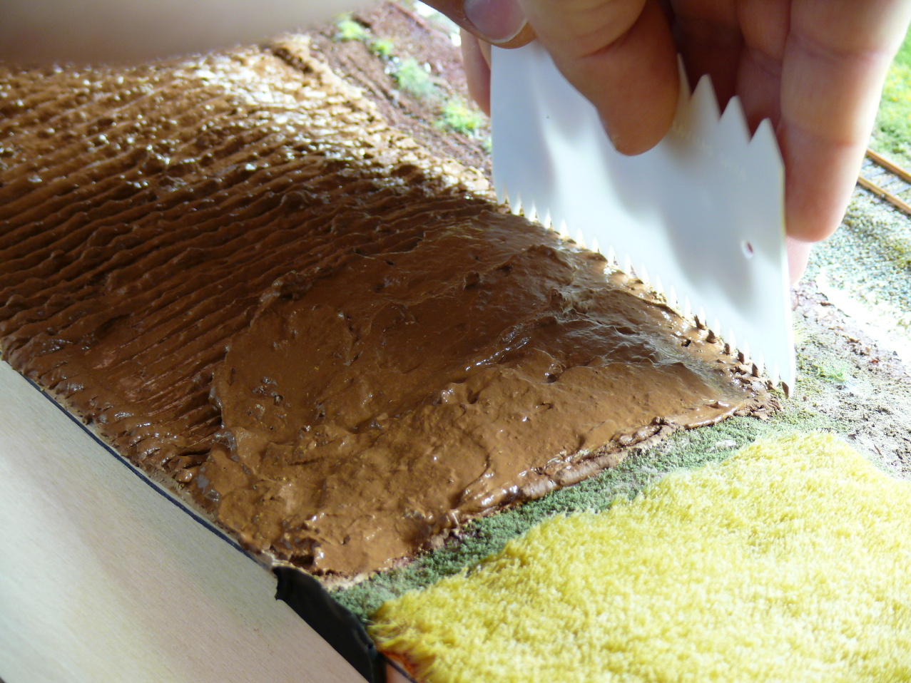 Na modul jsem pak nanesl směs na půdu a za pomocí stěrky jsem stahával od středu ke kraji a tím jsem docílil brázdy. Od středu proto, abych modul neušpinil a hlavně se přebytečná hmota dala daleko lépe sbírat. Vždy jsem nechával alespoň 2 zuby v předešlé již udělané brázdě, aby mezery byly stejné. Po zaschnutí jsem ještě provedl jeden menší nátěr samotnou barvou k docílení tmavšího odstínu pole.