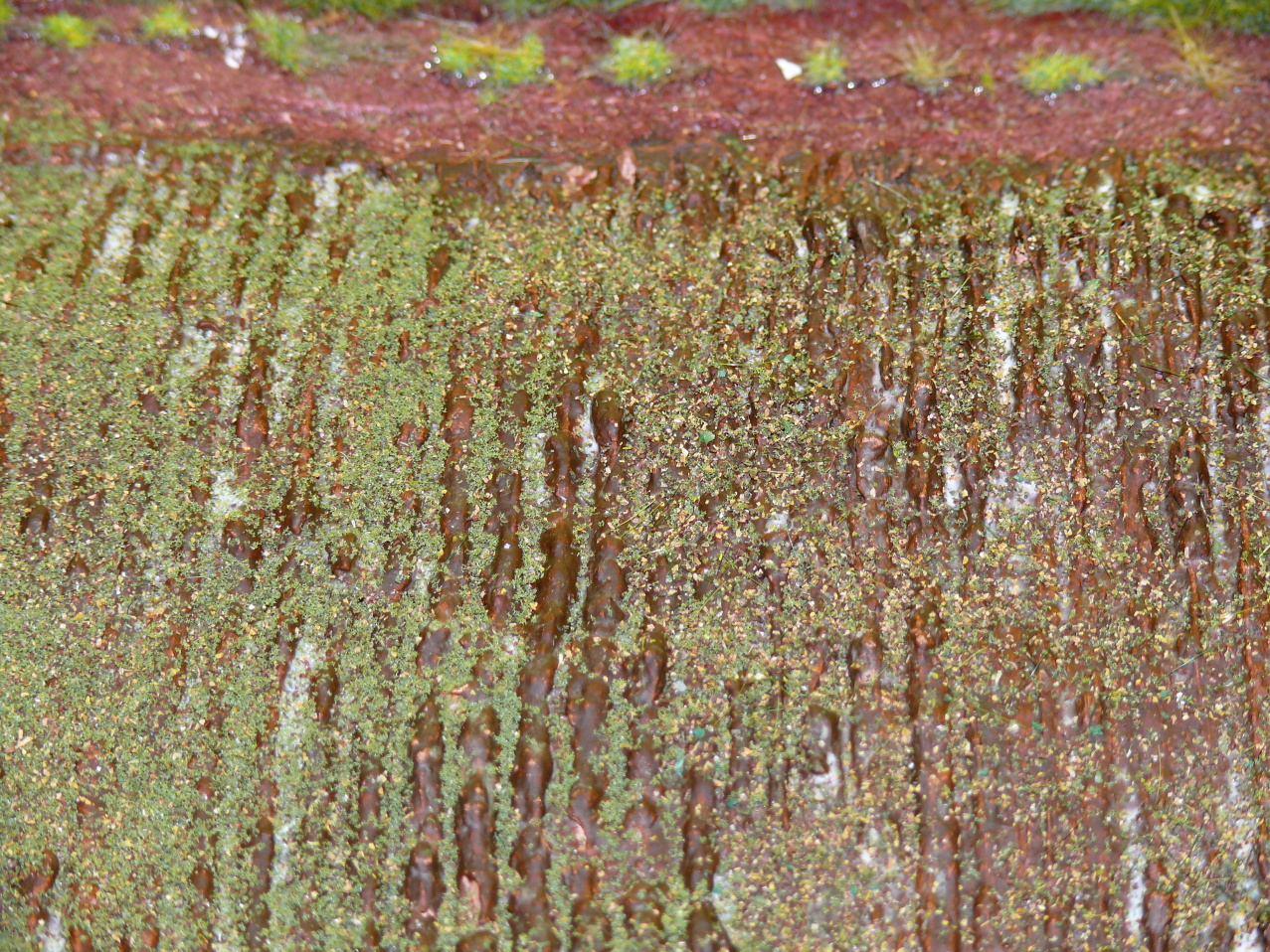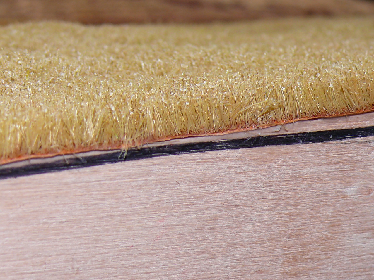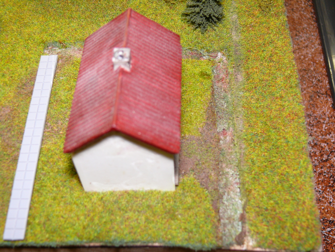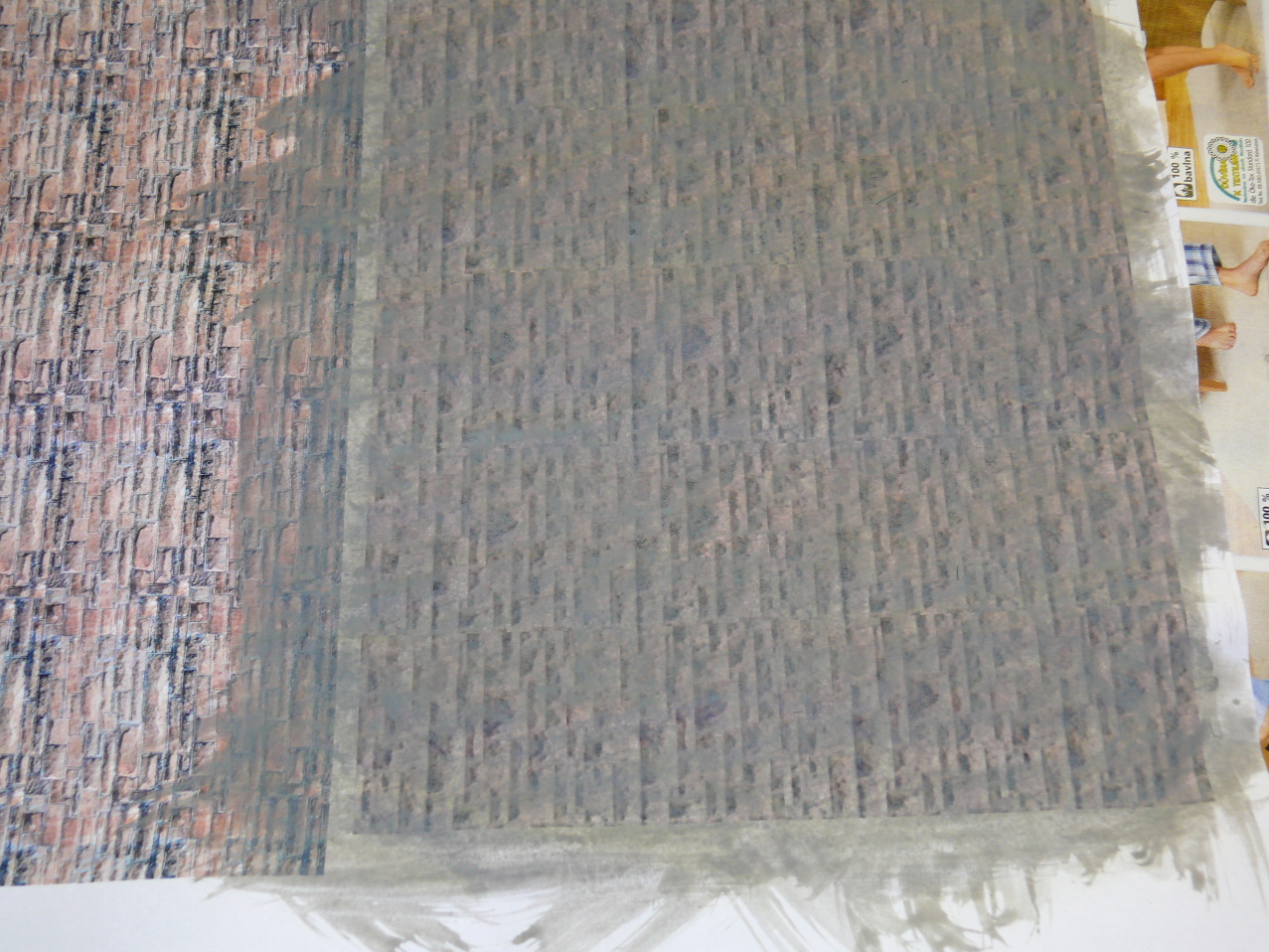 Na modul jsem pak nanesl směs na půdu a za pomocí stěrky jsem stahával od středu ke kraji a tím jsem docílil brázdy. Od středu proto, abych modul neušpinil a hlavně se přebytečná hmota dala daleko lépe sbírat. Vždy jsem nechával alespoň 2 zuby v předešlé již udělané brázdě, aby mezery byly stejné. Po zaschnutí jsem ještě provedl jeden menší nátěr samotnou barvou k docílení tmavšího odstínu pole.