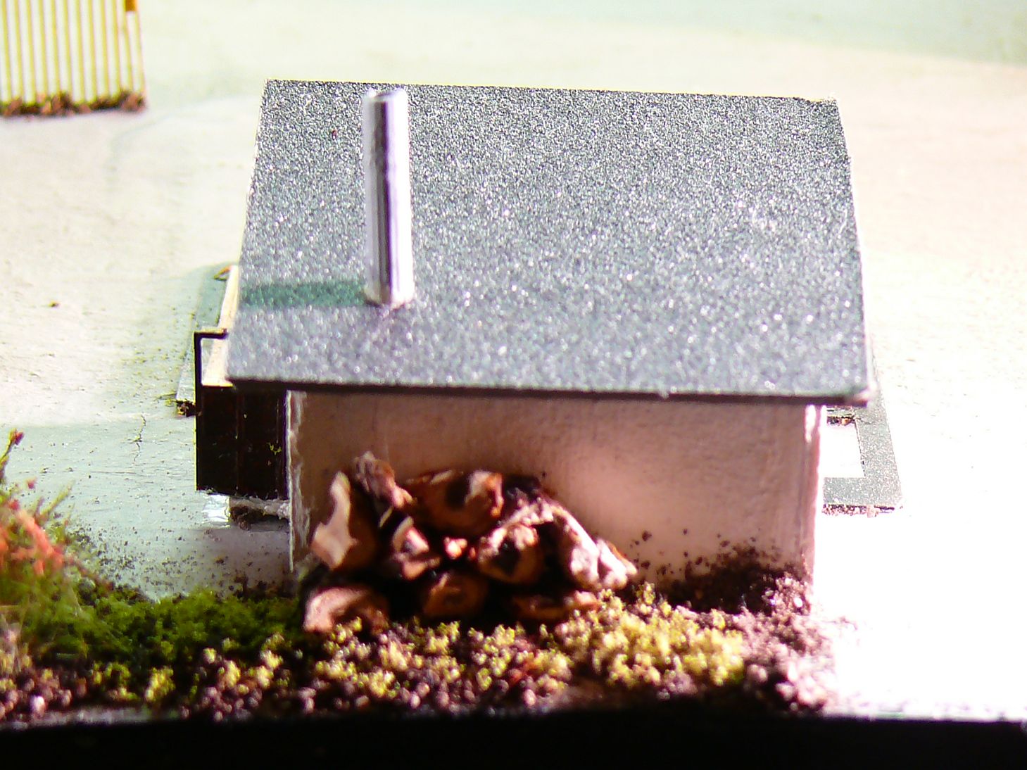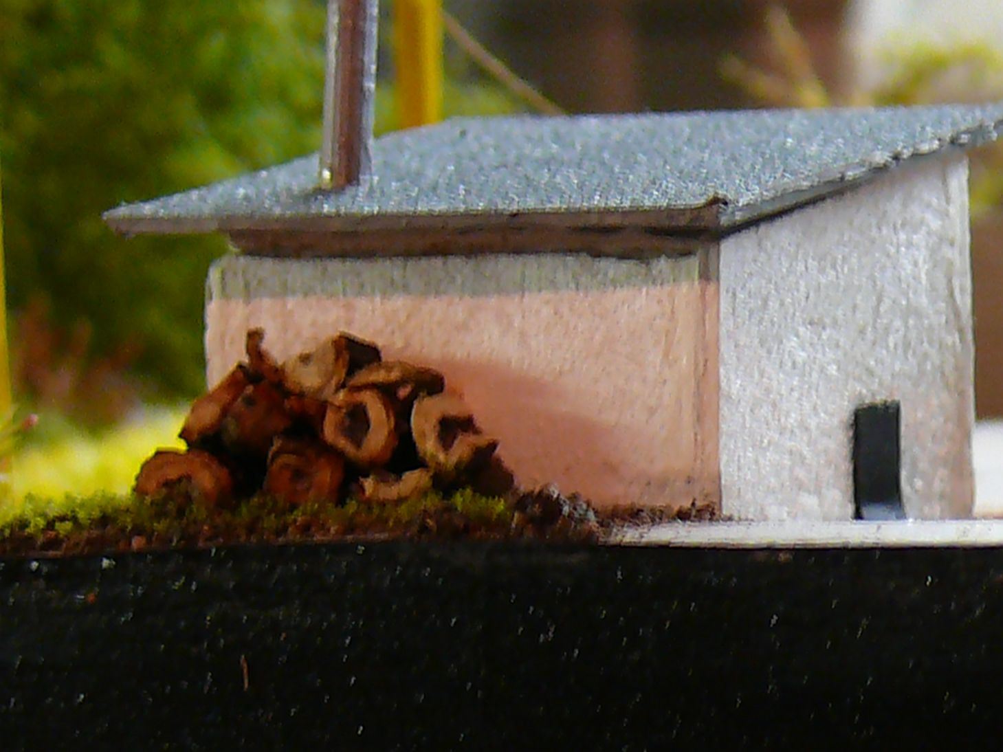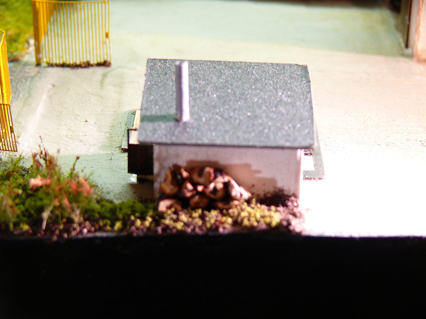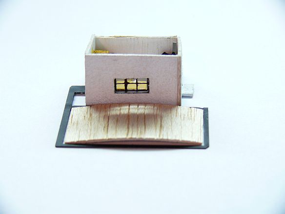Před budovou je vlastní vážící zařízení. Vyrobil jsem ho z rámečku od leptu a kousku balzy do které jsem naznačil prkna.