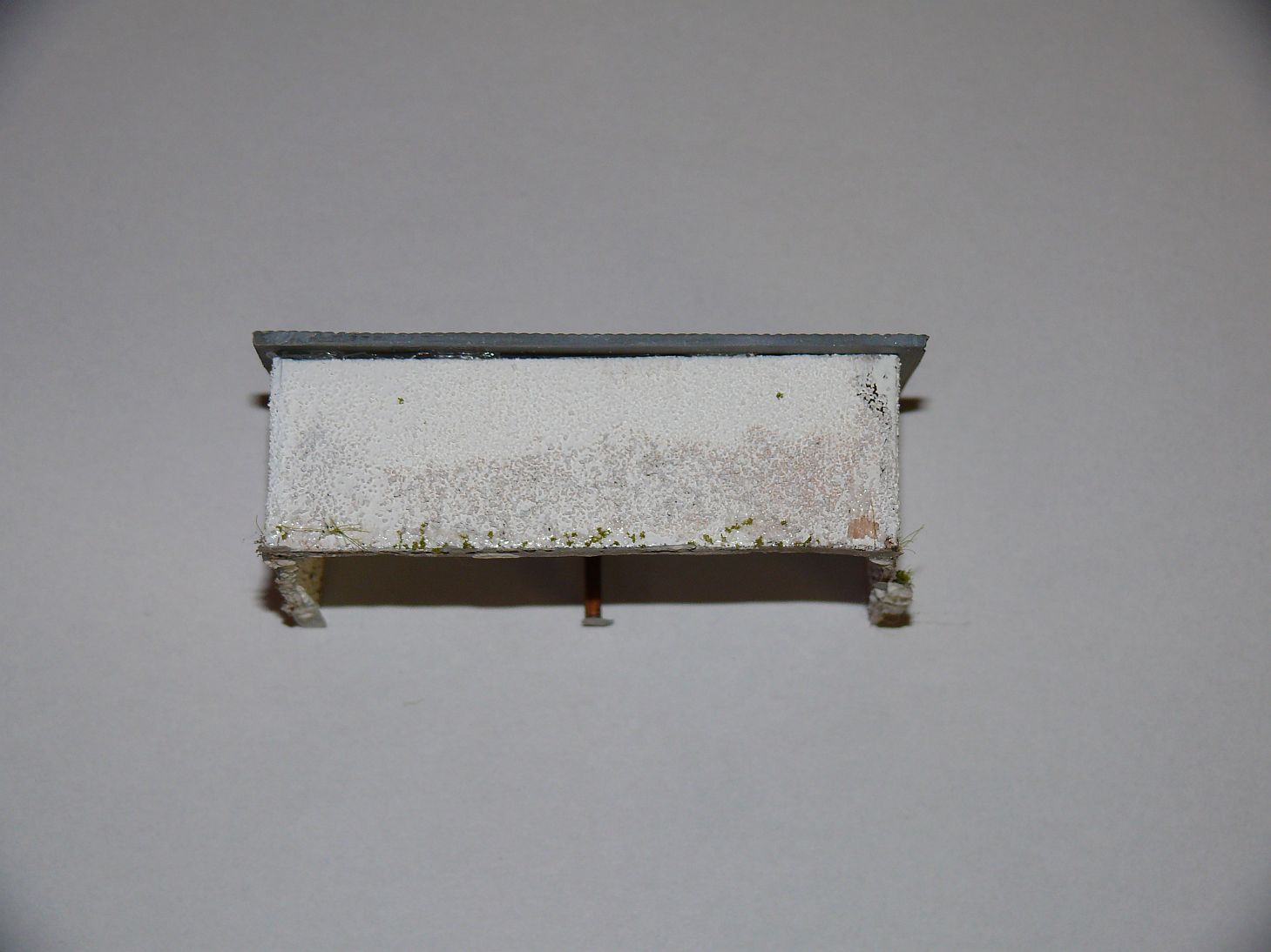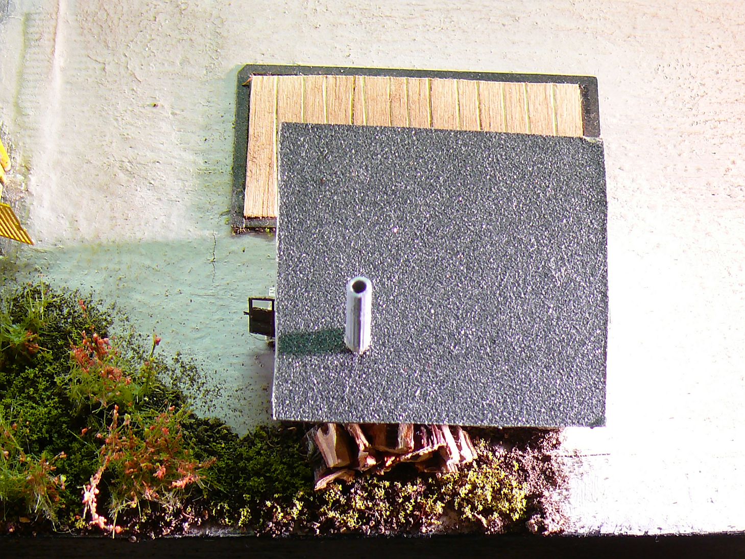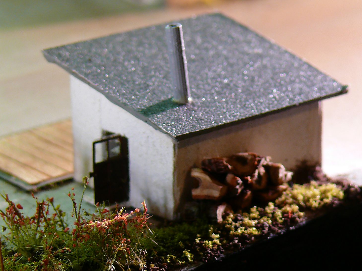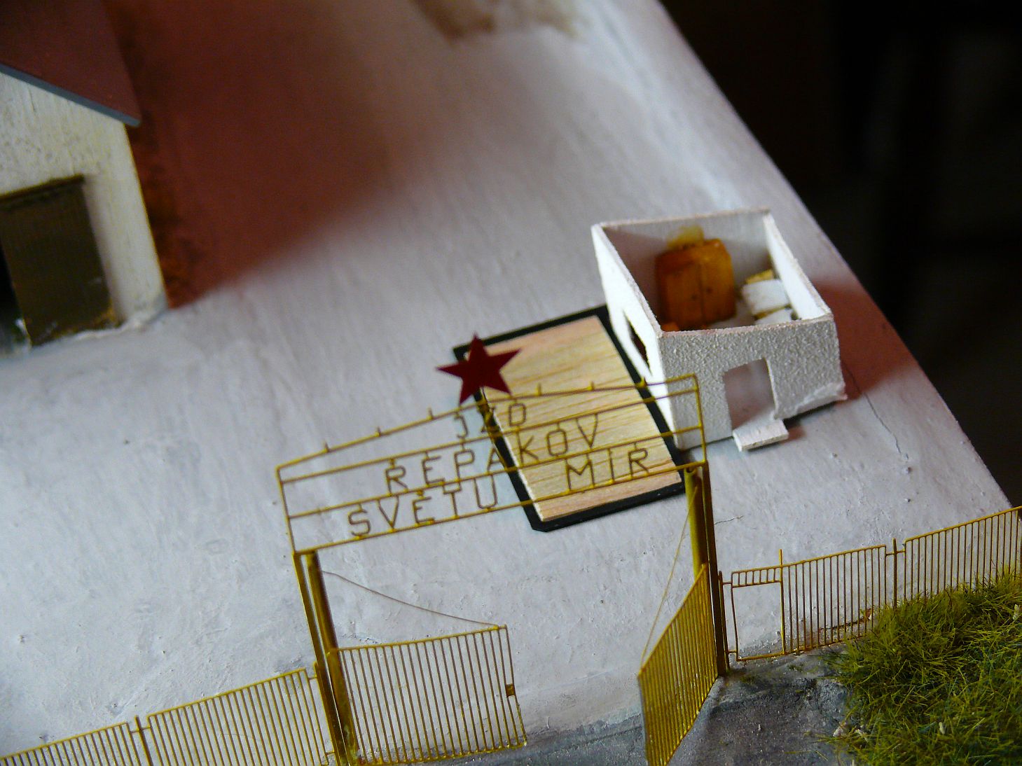 Před budovou je vlastní vážící zařízení. Vyrobil jsem ho z rámečku od leptu a kousku balzy do které jsem naznačil prkna.