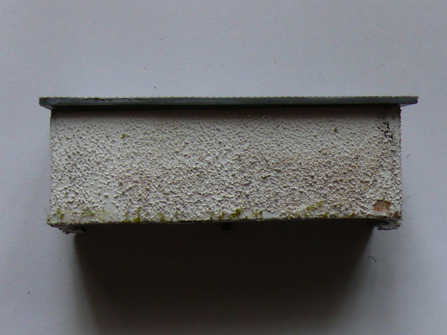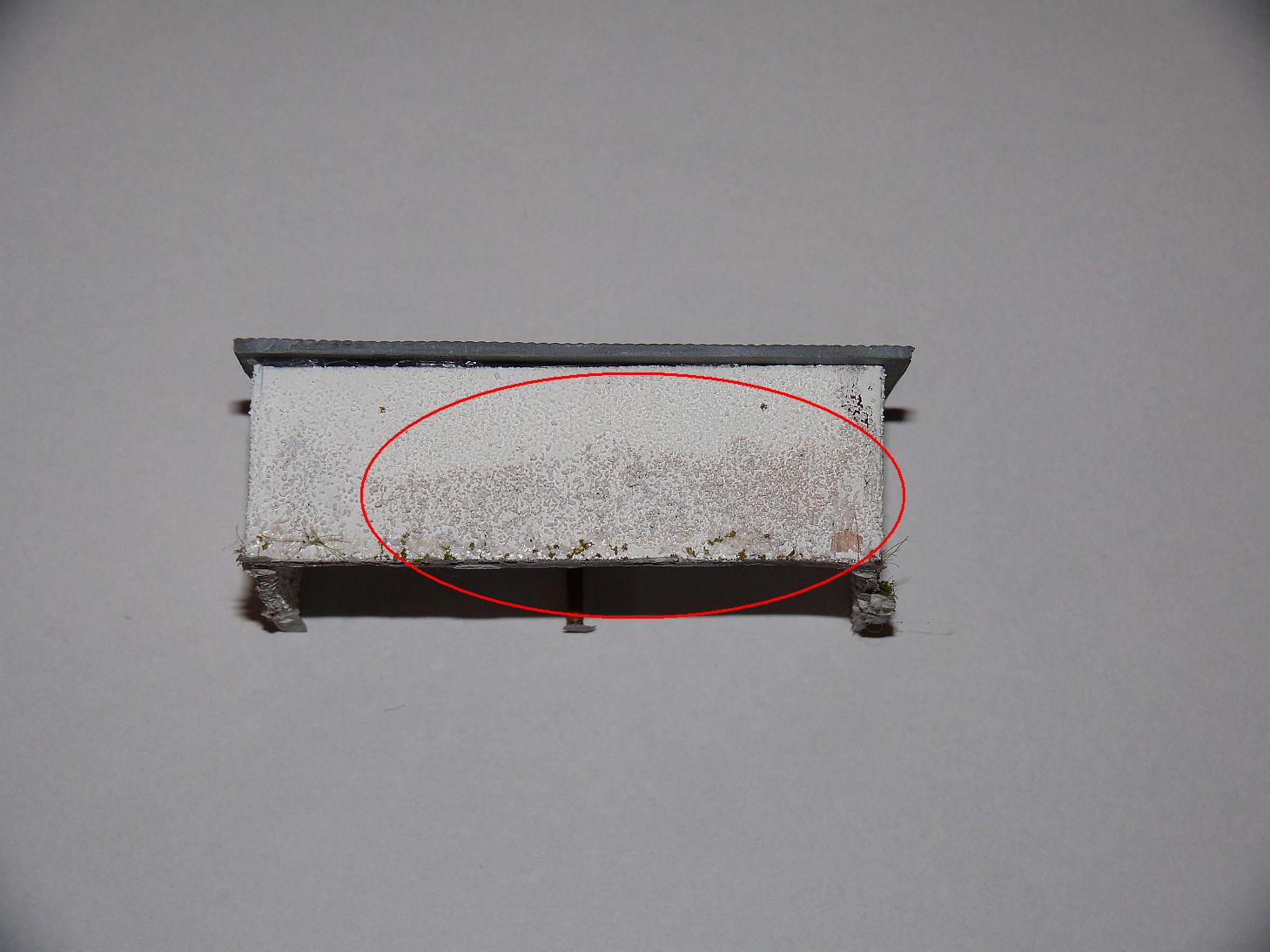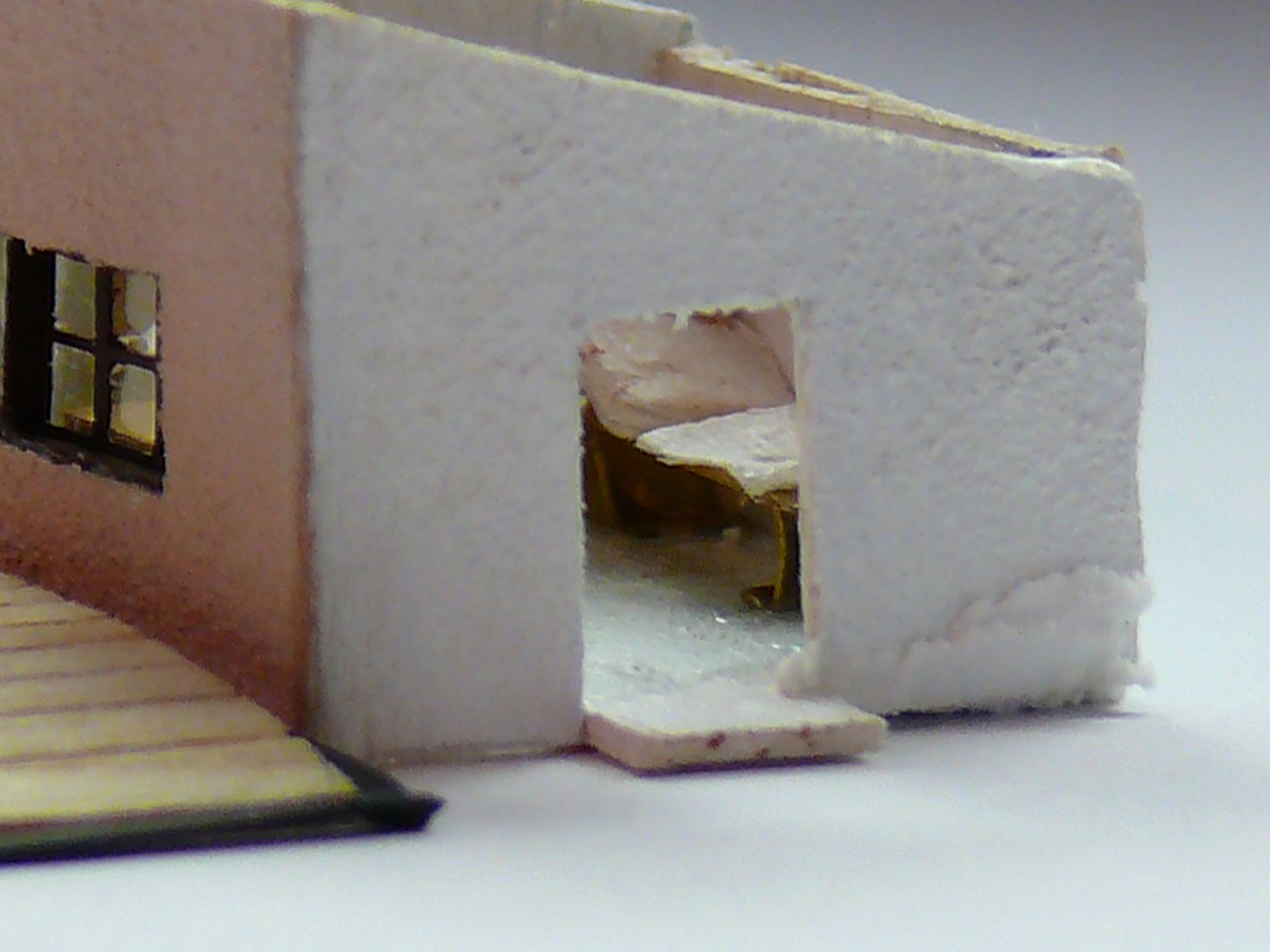 Nejdříve dojde k nabarvení vnitřní strany bílou barvou Vallejo. Po důkladném zaschnutí začnu s venkovní stranou. Připravím si do velmi jemného sítka polohrubou mouku. Nastříkám základní podklad na vnější stěnu a ještě vlhký ho posypu moukou.  Je potřeba pracovat rychle, aby barva moc nezaschla, to je velmi důležité. Pak po cca 5 min provedu druhý nástřik, přebytečná mouka je tlakem vzduchu z pistole sfouknuta a vy uděláte fixační nátěr, tento nátěr musí být velmi pečlivý, jinak vám mouka opadá. Po důkladném zaschnutí udělám dojem vlhké zdi pomocí hnědé Kolorky. Tahy vždy od spoda nahoru, vždy dole silnější a pokud možno do ztracena. Hnědou Kolorku neředím, přesto jsem s nanášením hnědé barvy opatrný. Po zaschnutí opět všechny stěny budovy přestříkám bílou Vallejo barvou. Kde bylo hnědé barvy více přestříkám toto místo vícekrát.