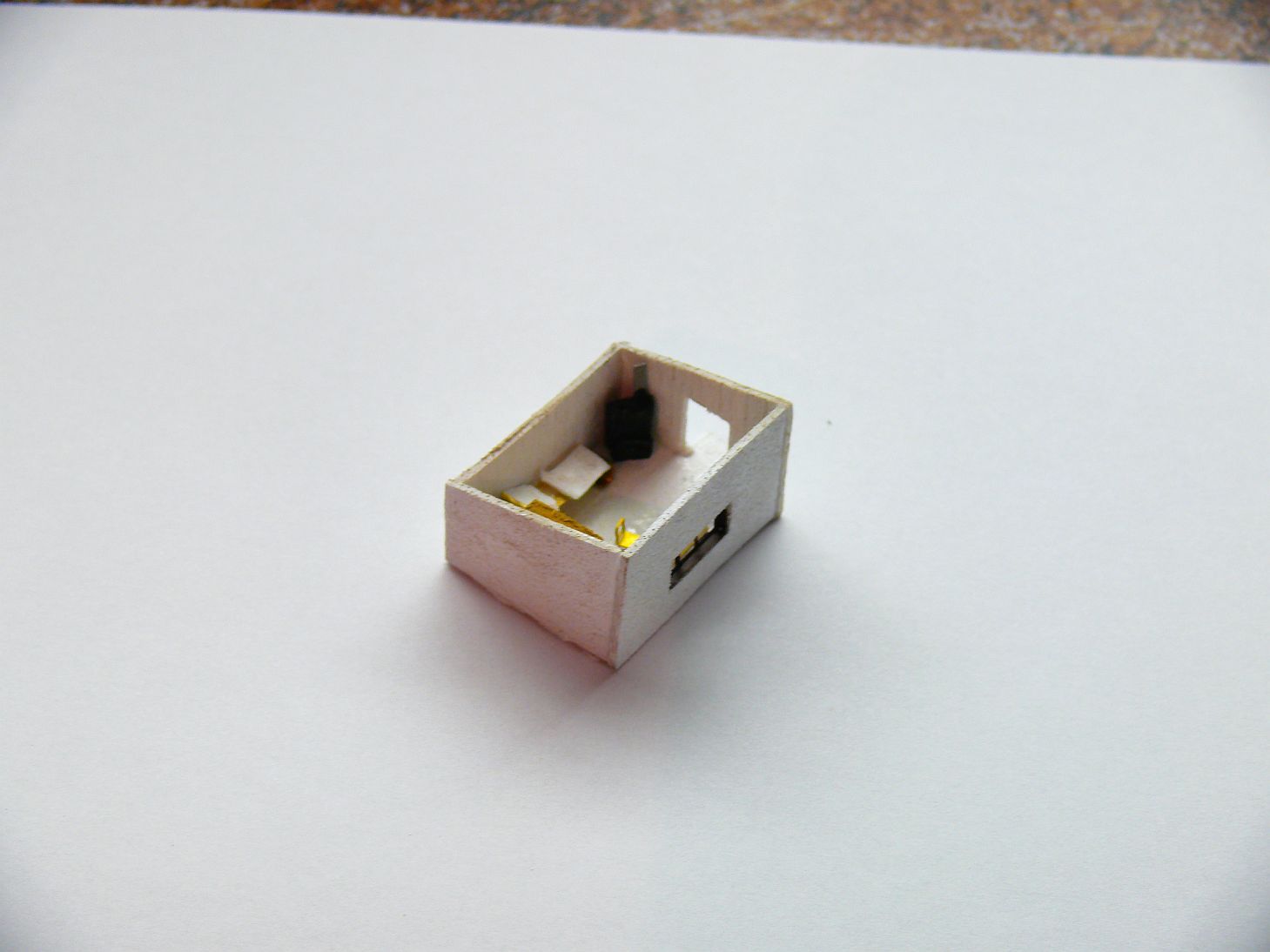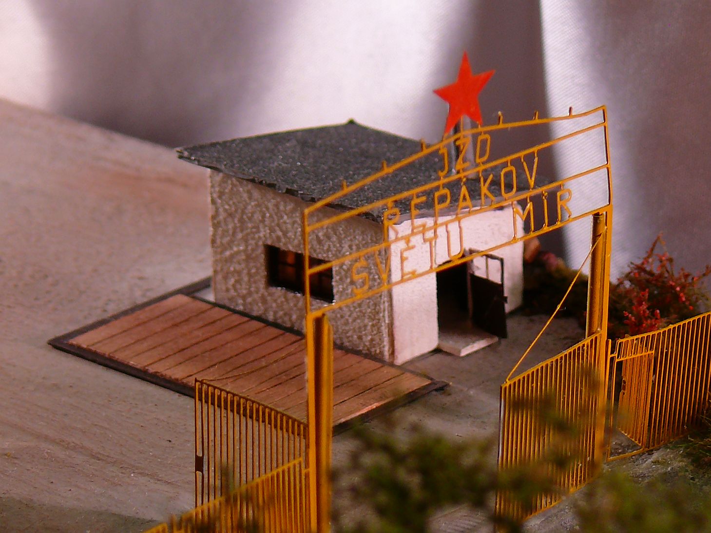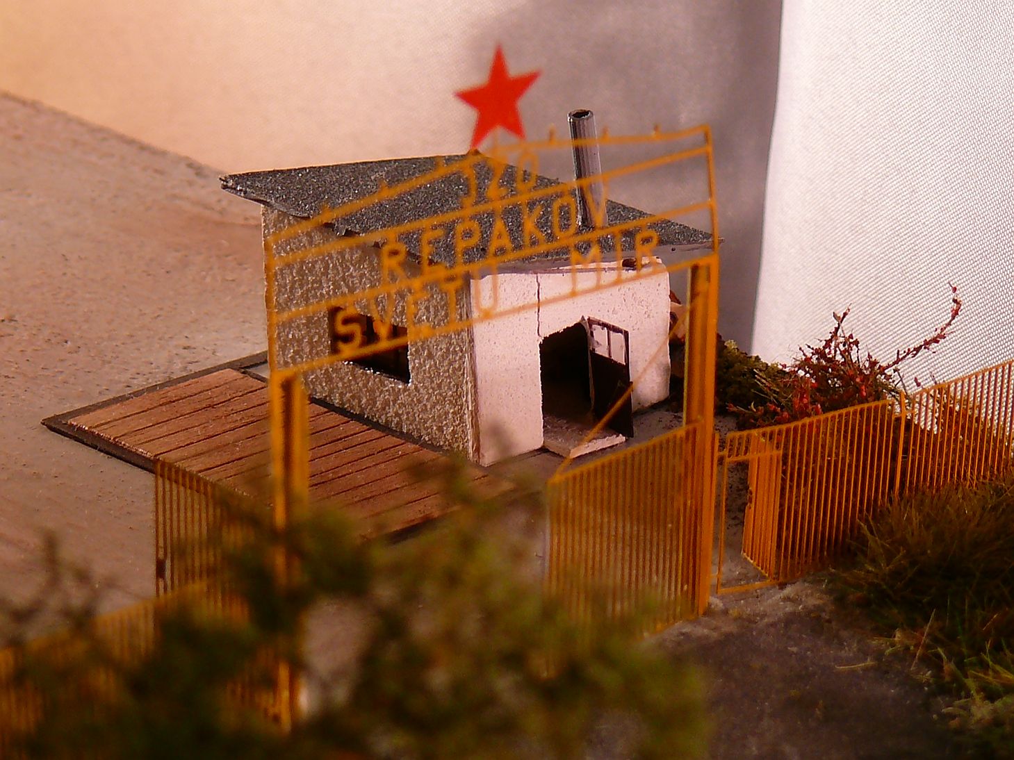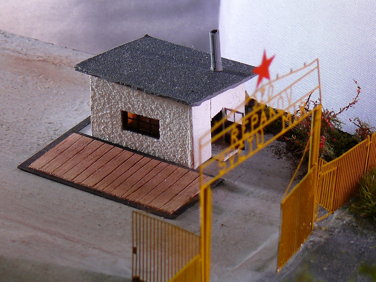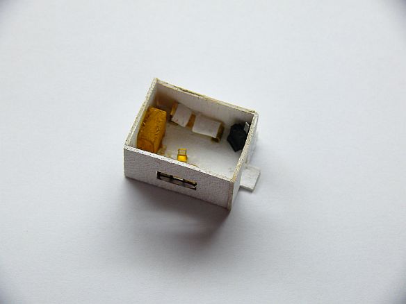 Vyrobil jsem i šatní skříň z laťky a nabarvil, vyrobil z leptu a ubrousku postel a na konec v každé vrátnici jsou kamna a budova váhy je součástí vrátnice, proto i zde jsou kamna.